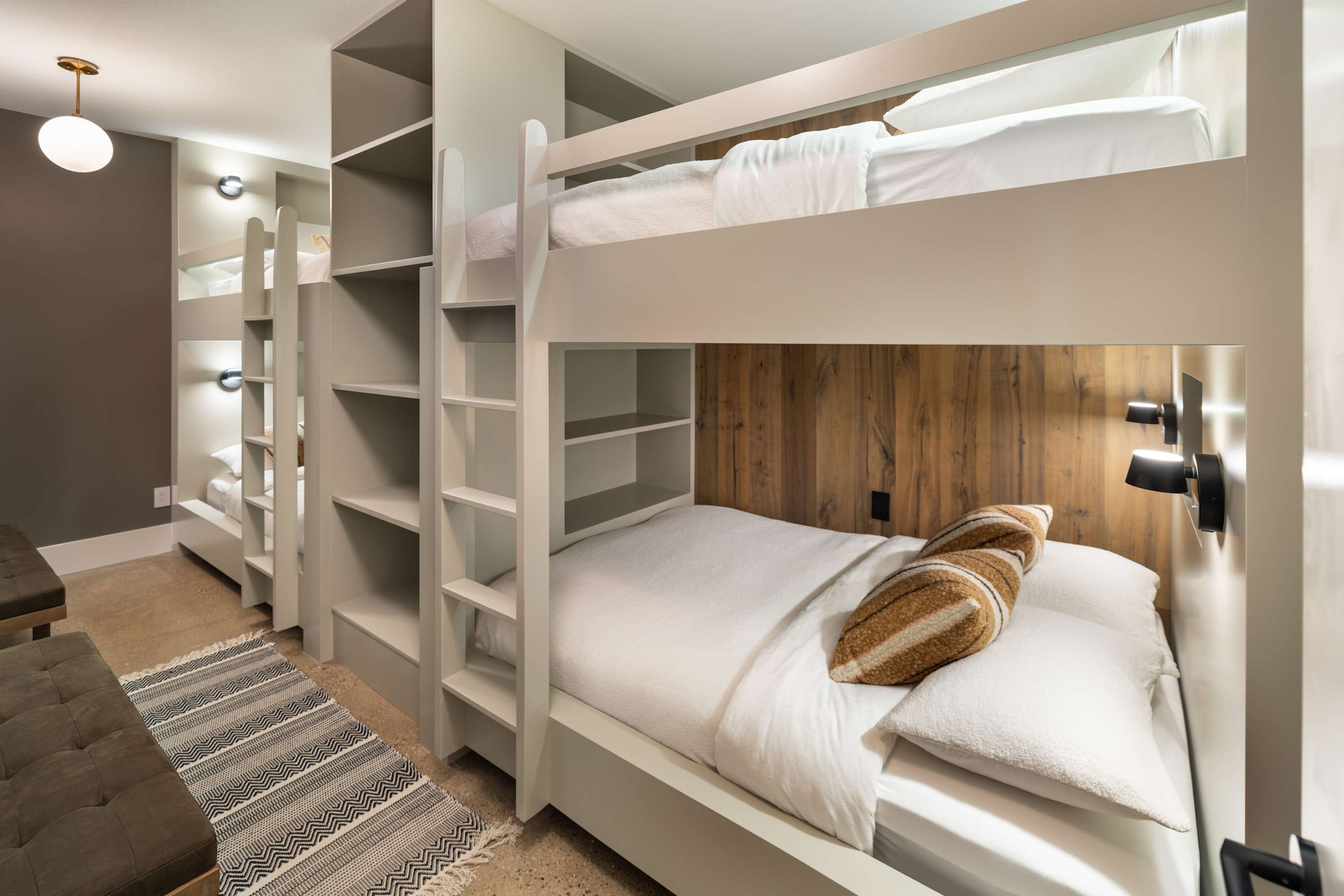 - Lower Floor: 2 Queen Bunk Beds (sleeps 8), 1 Queen Bunk Bed (sleeps 4), Rec Room with bar, Ski Locker, Private Hot Tub
