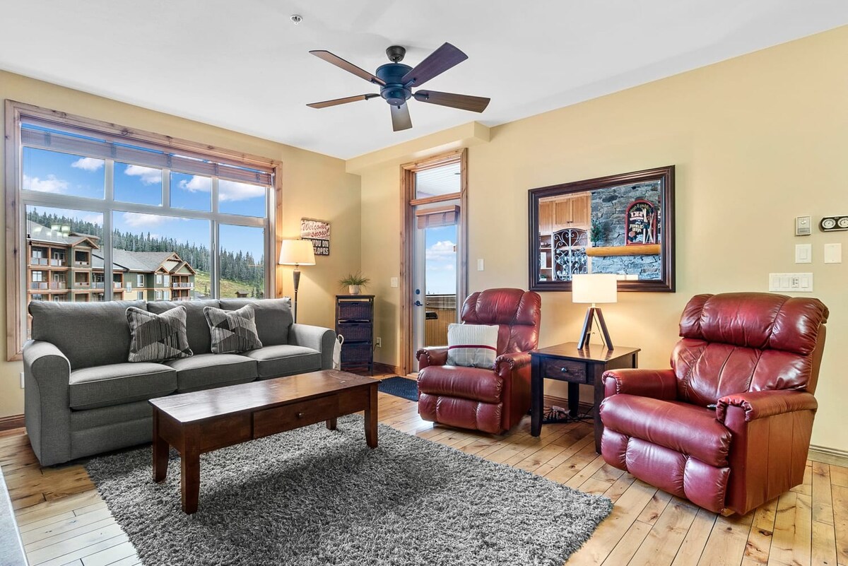 Located in the Aspens, we welcome you to "Ski Ya Later!" This luxurious ski-in/ski-out 2 bedroom, 2 bath chalet that comfortably sleeps 8 guests is everything you need for the ski trip you've been looking for. Our chalet has a private hot tub and is the ultimate ski in/ski out location! Just walk out the door, put on your skis and hit the slope. We are located right across from the Telus Park on Sun Run, a great green run which is lit for night skiing as well.